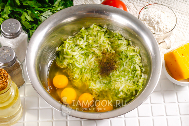 В емкость с кабачковой массой вбейте куриные яйца, всыпьте молотый черный перец. Соль добавлять не нужно - она там уже есть. Тщательно взбейте всю массу.