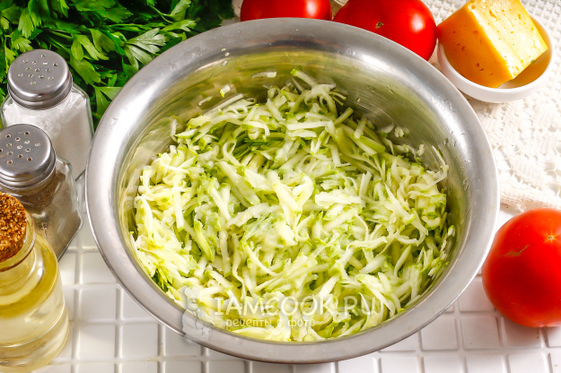 Крупный, но не перезревший кабачок промойте в воде и срежьте с него хвостики. Вы можете использовать несколько мелких плодов - по желанию. Натрите овощ на терке с крупными ячейками в миску или салатник и всыпьте половину указанной нормы соли. Перемешайте и оставьте на 10 минут, чтобы масса выделила жидкость. Затем слейте ее, а в емкость добавьте воду. Кабачковый сок очень «мягкий», и если его не слить, то блины могут рваться при переворачивании. Мне проще заменить его водой, чем добавлять большое количество куриных яиц.