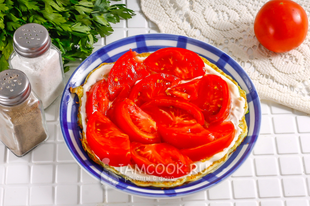 Помидоры промойте и вырежьте сердцевинки. Нарежьте ломтиками. Смажьте кабачковый блин майонезом с чесноком или не смазывайте, исключив соус из приготовления. Выложите томатную нарезку.