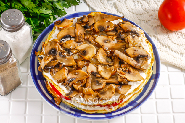 Накройте вторым блином и выложите грибы на соус или без него. И т.д., пока не соберете весь торт.
