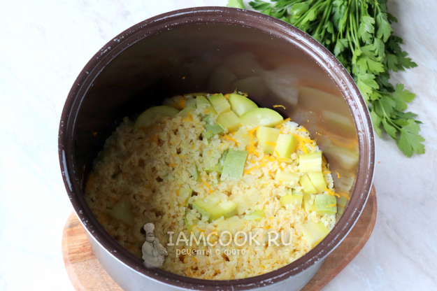 Закройте крышку мультиварки и выберите режим "Рис/крупы", нажмите кнопку "Старт". Готовьте булгур с кабачками в мультиварке 25 минут до звукового сигнала.
