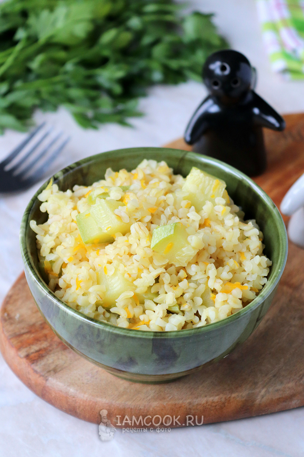 Вот и всё, вкуснейший булгур с кабачками готов. Аккуратно перемешайте его и разложите по порционным тарелкам. На стол подавайте в тёплом виде.