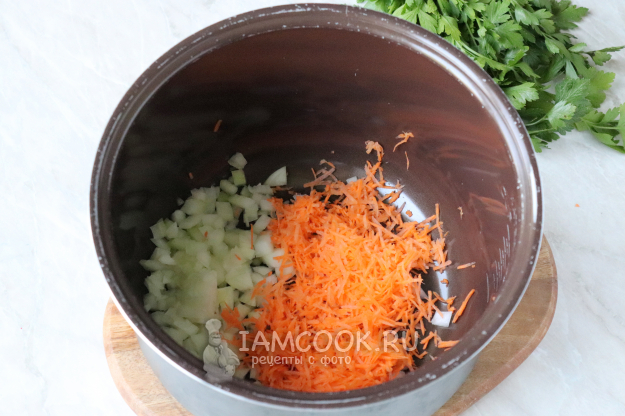 Лук нарежьте кубиками, а морковь натрите на тёрке со средними ячейками. Выложите овощную нарезку в чашу мультиварки, добавьте растительное масло и выберите режим "Жарка", нажмите кнопку "Старт". Готовьте 5-7 минут, периодически помешивая деревянной лопаткой, чтобы овощи не подгорели. Затем нажмите кнопку "Отмена".