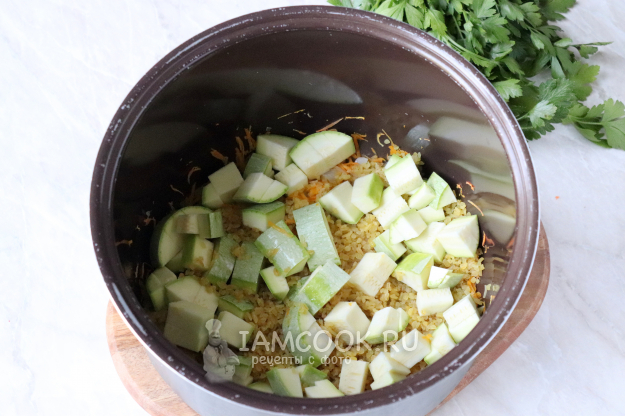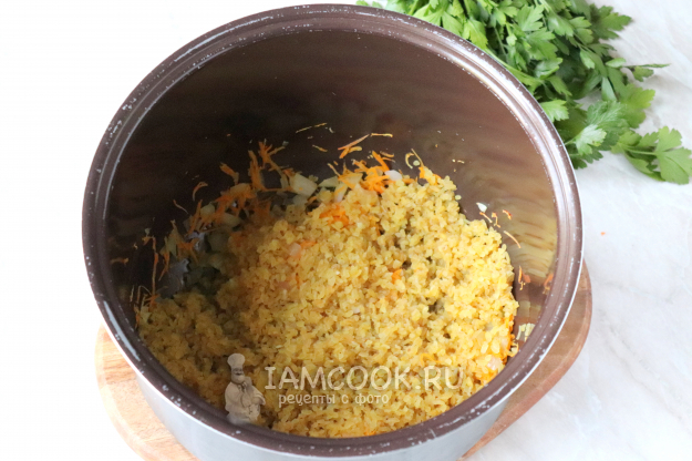 Булгур промойте в холодной воде, меняя её 3-4 раза. После чего выложите крупу в чашу к зажарке.