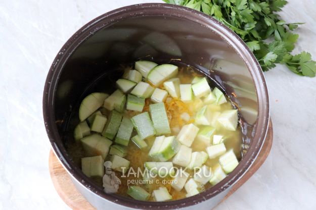 Кабачок нарежьте средними кубиками и также отправьте в чашу. Посолите по вкусу.