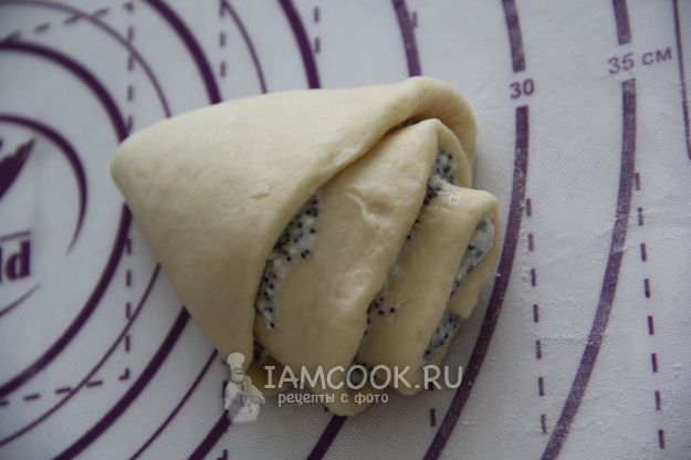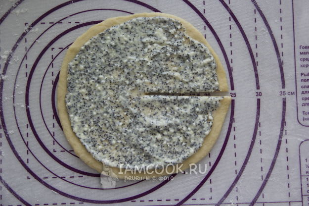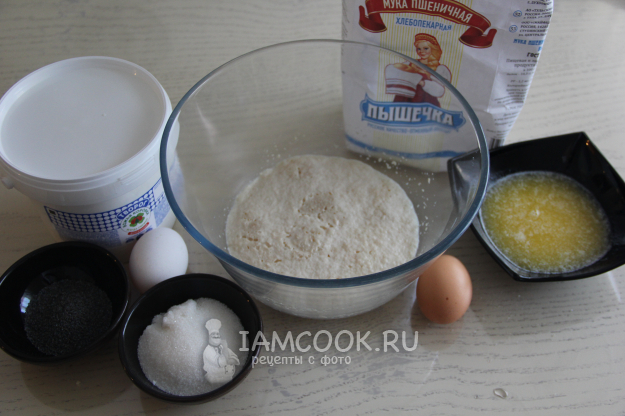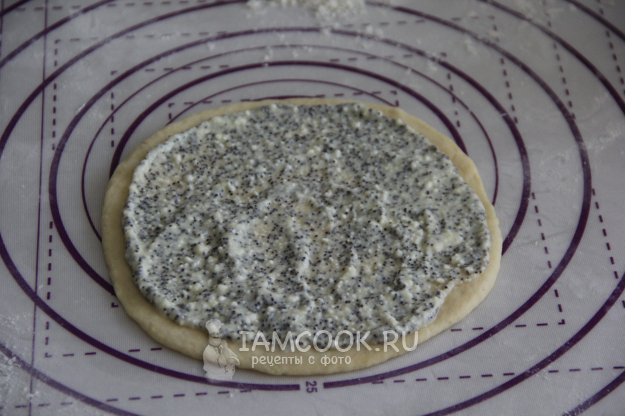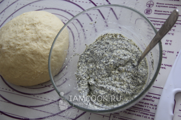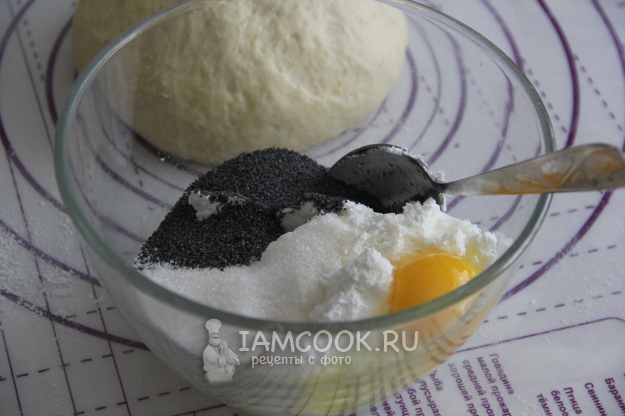 Тесто обмять и переложить на стол. Приготовить начинку. Творог (у меня 9%) соединить с сахаром, маком и яйцом.