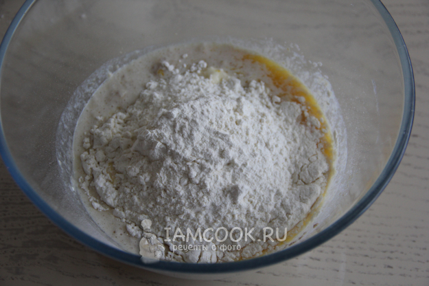 Всыпать муку небольшими порциями и перемешивать сначала ложкой, а затем вымесить тесто руками. Оно получится нежным и мягким.