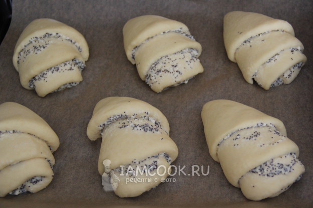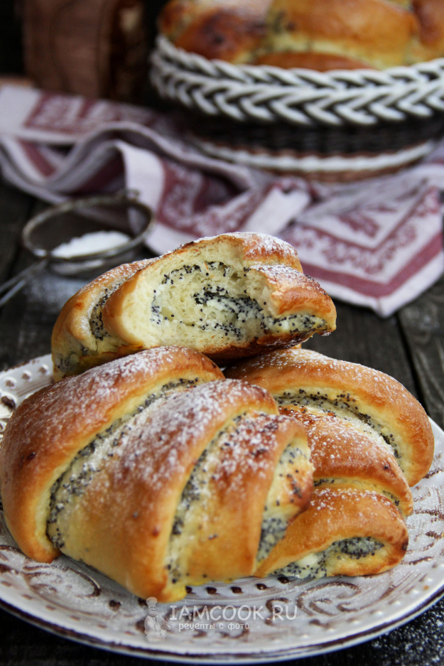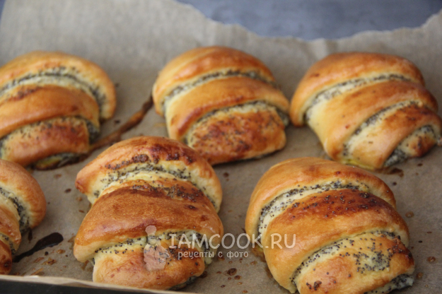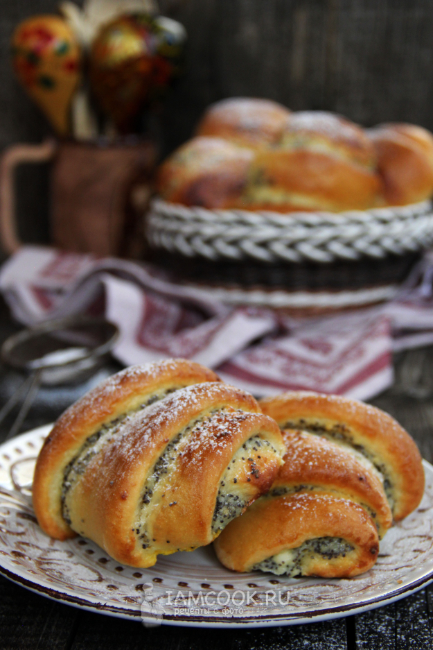 Выпекать сдобные булочки с творогом и маком в разогретой духовке при 200 градусах примерно 25 минут.