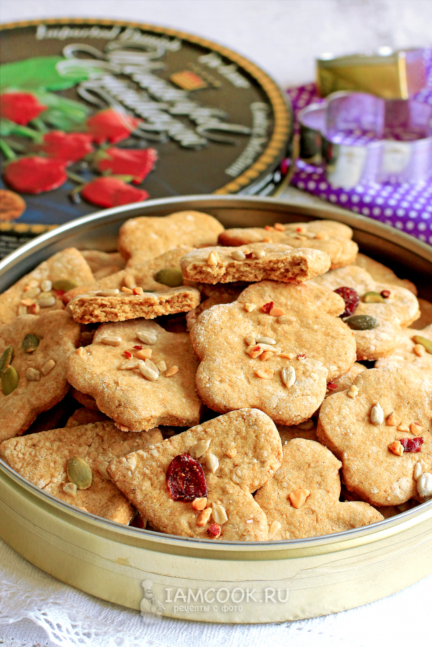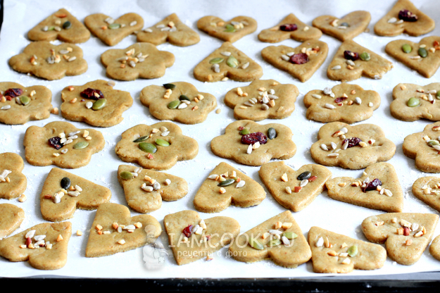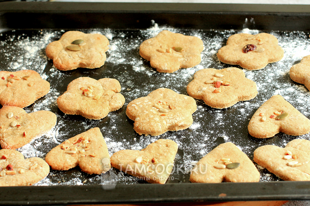 Противень можно просто посыпать мукой или застелить антипригарным пергаментом. Я делала и так и этак, все попробовала. Разложите заготовки печенья на противень и, по желанию, украсьте их семечками, орешками, вяленой клюквой или оставьте так.