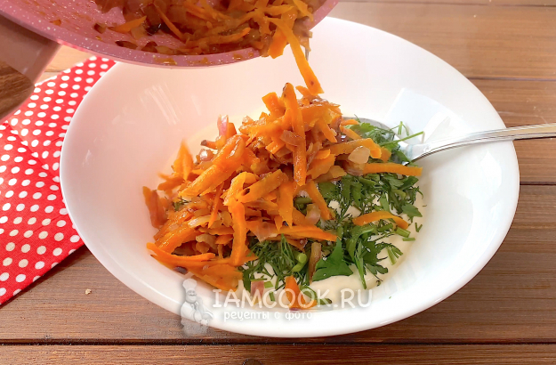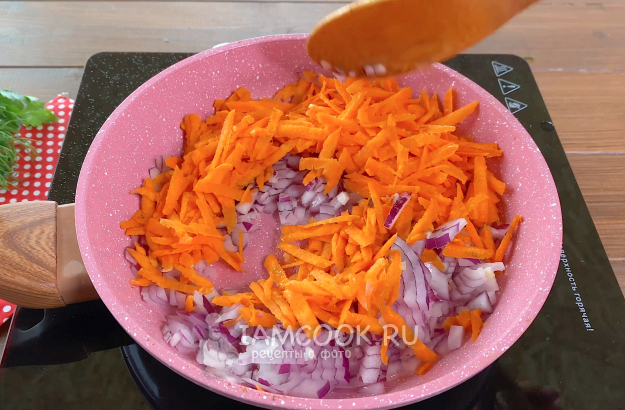 Разогрейте сковороду с растительным маслом, выложите нарезанный лук и тертую морковь, обжарьте до мягкости.