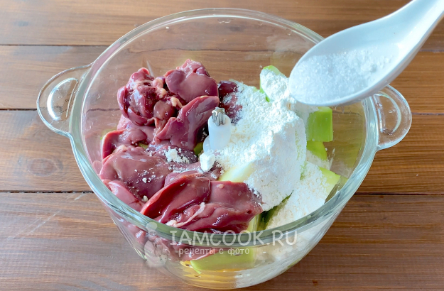 Итак, если у вас молоденький кабачок, его не нужно чистить и семечки можно оставить, но если перезревший, тогда удалите семена и очистите от кожицы. Затем нарежьте на кусочки и выложите в чашу блендера. Добавьте промытую печень, яйцо и муку. Посолите по вкусу и измельчите в однородную массу.