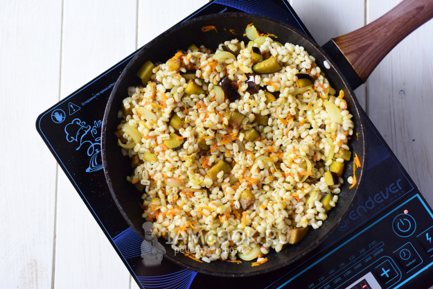 К овощной массе добавим отварную перловку, перемешаем и снимем сковороду с плиты.
