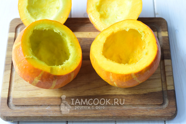 Подготовим тыковки: срежем верх (крышечки), внутреннюю часть вычистим от семечек и мякоти так, чтобы у нас получилась пустая тыквенная емкость с толщиной стенок примерно в 1-1,5 см.