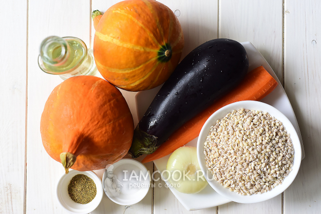 Подготовим необходимые ингредиенты для запекания перловки в тыкве в духовке. Почистим лук и морковь, помоем все овощи.