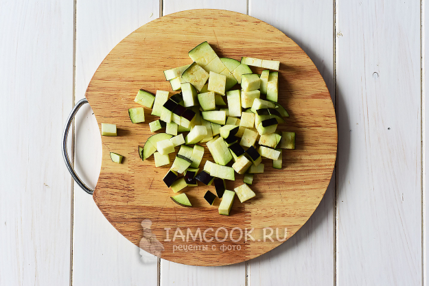 Кубиками нарезаем баклажан.