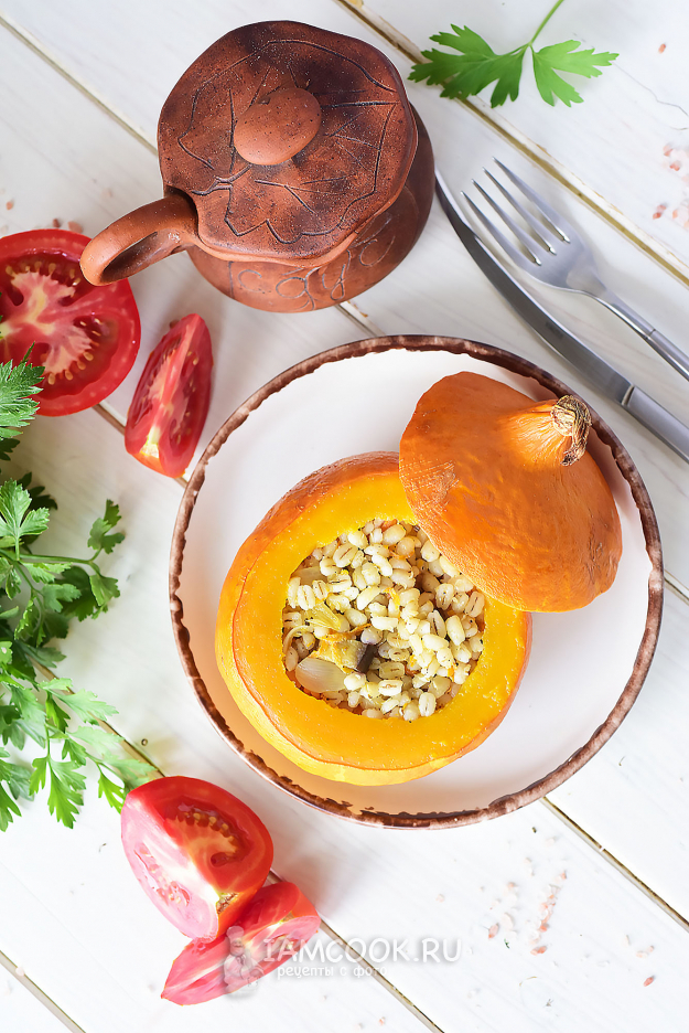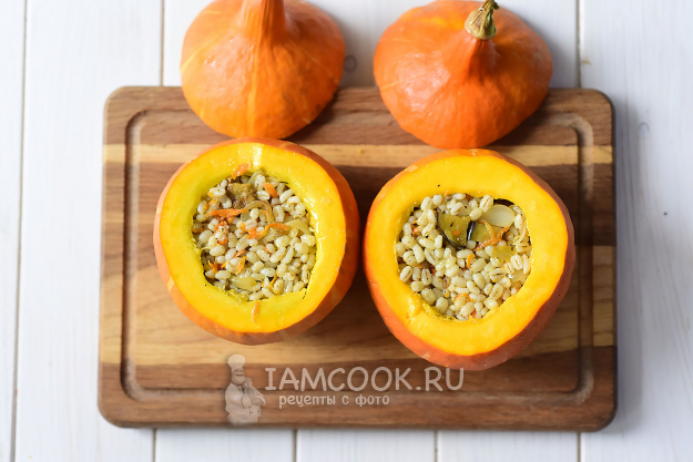 Все тыквенные емкости заполним перловкой с овощами, накроем тыквенными крышечками (которые тоже почистили от семян). Дно формы смажем растительным маслом и выложим две заполненные тыковки с крышечками. Запекаем перловку в тыкве в духовке, заранее разогретой до 180 градусов, 35-40 минут.