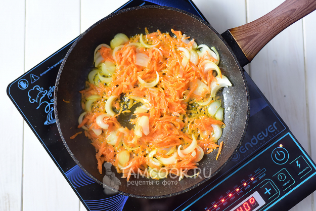 В сковороде разогреем растительное масло и выложим лук, морковь.