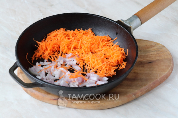 Лук нарежьте кубиками, морковь натрите на тёрке со средними ячейками. Выложите овощи в сковороду или в кастрюлю с толстым дном и добавьте немного растительного масла. Жарьте овощи 5-7 минут, периодически помешивая, чтобы не подгорели.