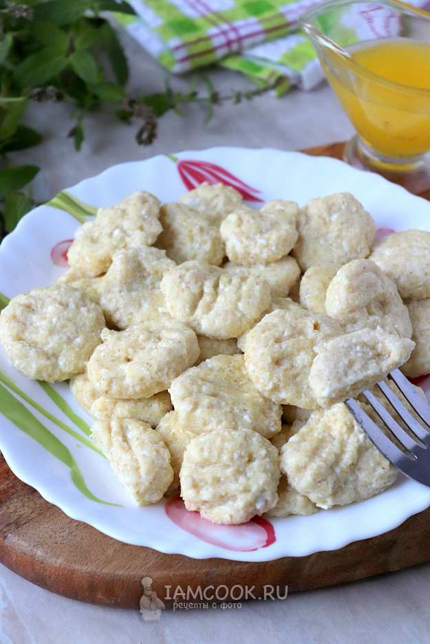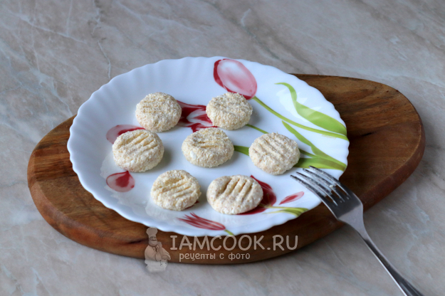 Из творожного теста скатайте небольшие шарики (перед этим ладони лучше смочить водой), затем каждый шарик немного придавите зубчиками вилки, делая его более плоским, с красивым узором (как на фото).