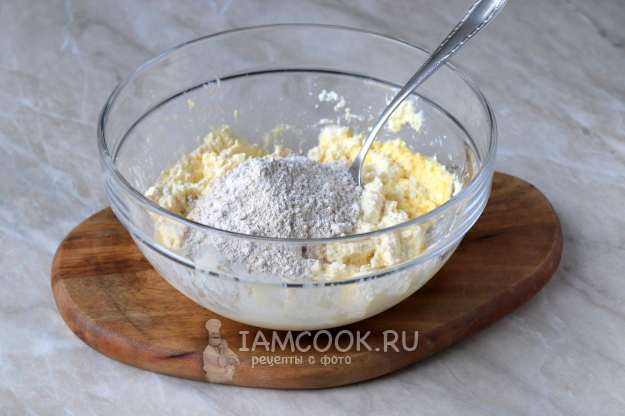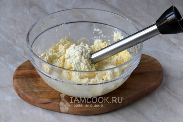 В глубокой миске соедините творог, куриное яйцо и сахарный песок. Погружным блендером взбейте массу до однородного состояния. Если у вас нету блендера - предварительно перетрите творог через мелкое сито, и только потом соединяйте его с остальными продуктами.