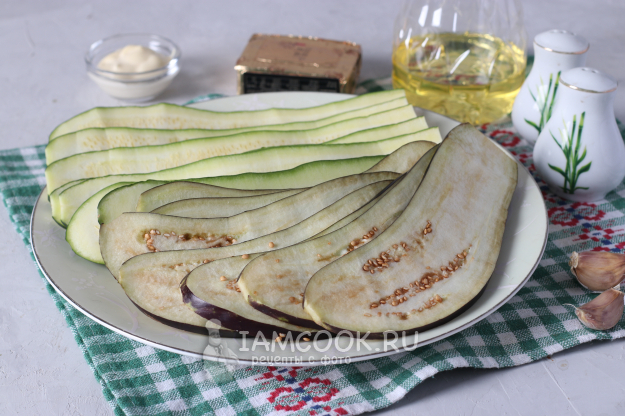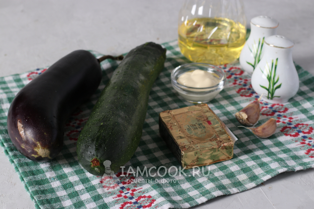 Для приготовления рулетов из кабачков с баклажанами и сыром подготовить из списка необходимые ингредиенты.