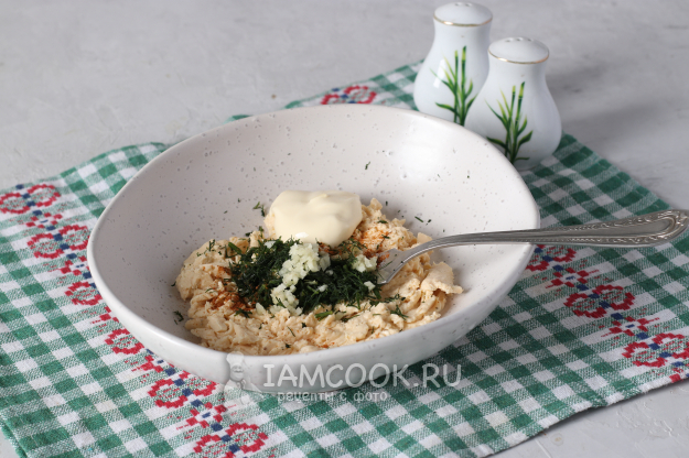 Пока овощи запекаются, приготовить начинку. Размять плавленый сырок, добавить соль, перец, измельчённый укроп и чеснок.