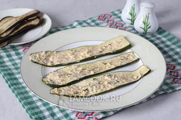 На тарелку выложить остывшие пластины кабачков, немного смазать сырной начинкой.