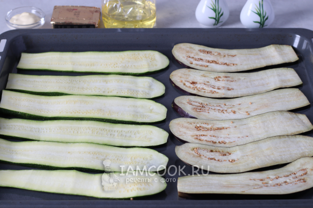 Противень смазать растительным маслом или застелить пергаментом, выложить пластины баклажанов и кабачков. Сверху также сбрызнуть маслом, немного посолить. Разогреть духовку до 200 градусов и запечь овощи в течение 10-12 минут, затем их остудить.