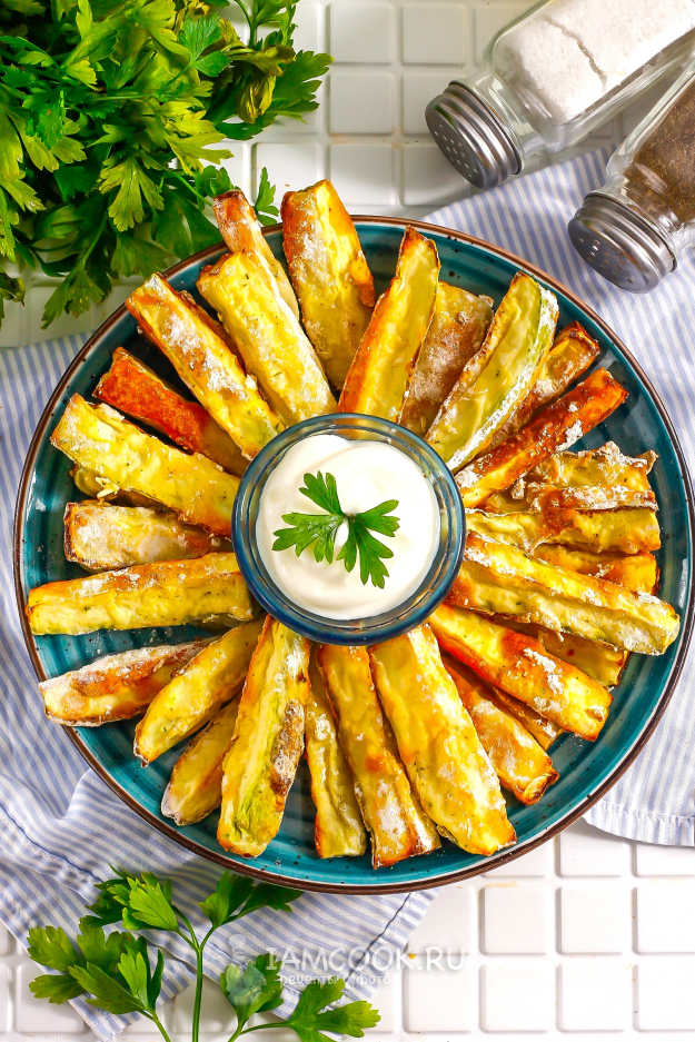 Запеченные в духовке наггетсы из кабачков брусочками готовы. В середину тарелки поместите пиалу с соусом или сметаной, вокруг разложите кабачковые наггетсы, выкладывая их из противня теплыми. Подайте к столу.