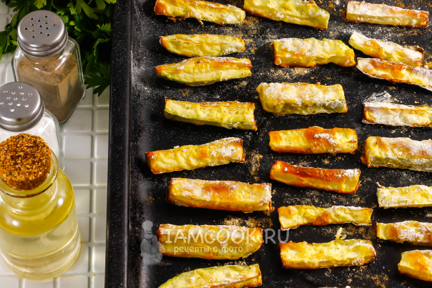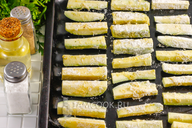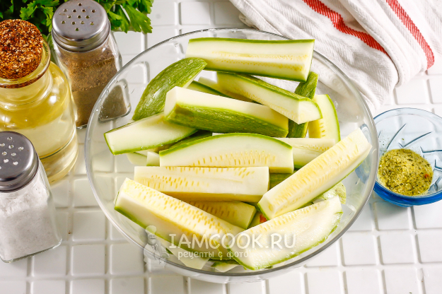 Кабачки промойте в воде, срежьте хвостики с обеих сторон плодов. Нарежьте их пластинами в 1 см толщиной, а пластины нарежьте брусочками такой же ширины. Слегка обсушите нарезку бумажными салфетками, но не солите! Соль вытянет жидкость из кабачков и они после запекания станут суховатыми на вкус.