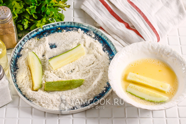 Вбейте куриное яйцо в пиалу, взбейте 1 минуту. Обмакните нарезку кабачков в яйцо, затем в муку. Если любите хрустящий слой в наггетсах, то повторите такую процедуру два раза.