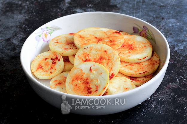 Посыпьте кабачки копченой паприкой. К влажной поверхности паприка хорошо прилипает. Распределите специю по поверхности кружков.