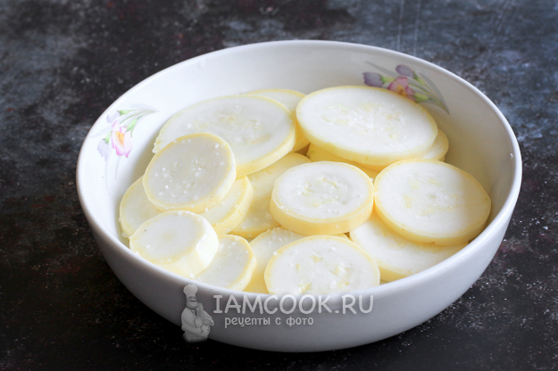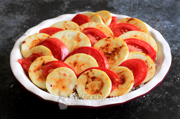 Кабачки нарежьте на колечки, толщиной не более 5-7 мм, посолите и дождитесь, когда они станут влажными. Помидоры тоже нарежьте колечками.