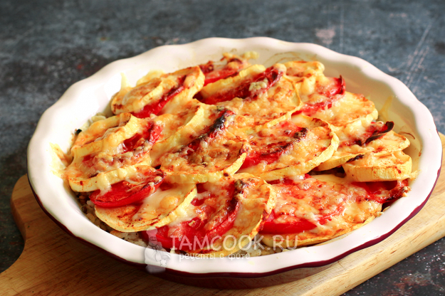 Выложите кабачки и помидоры поверх риса, слегка сбрызните растительным маслом и поставьте запекать под верхний тэн на 20 минут. Температура средняя, видимо, 170 градусов. У меня все запекалось под газовым грилем.