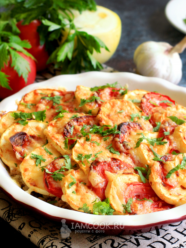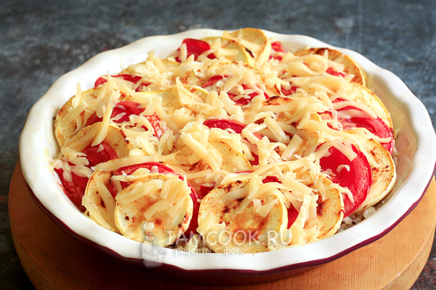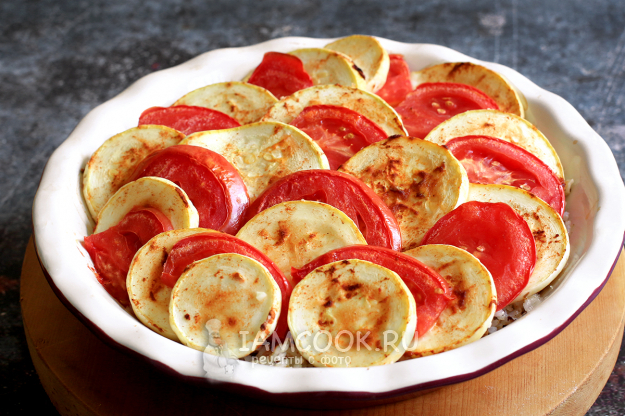 Через 10 минут достаньте форму с кабачками и помидорами.