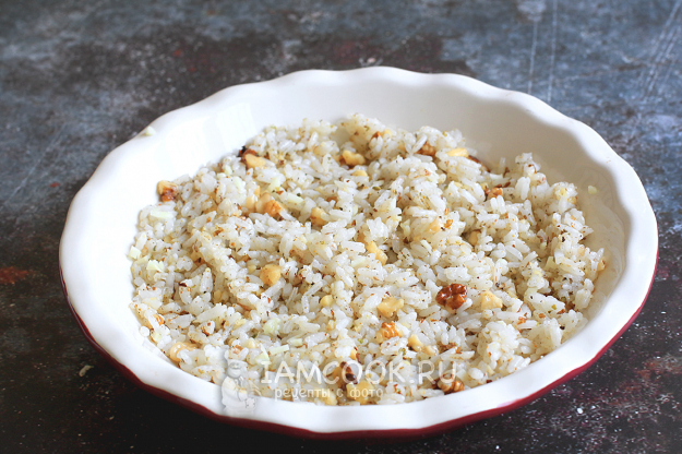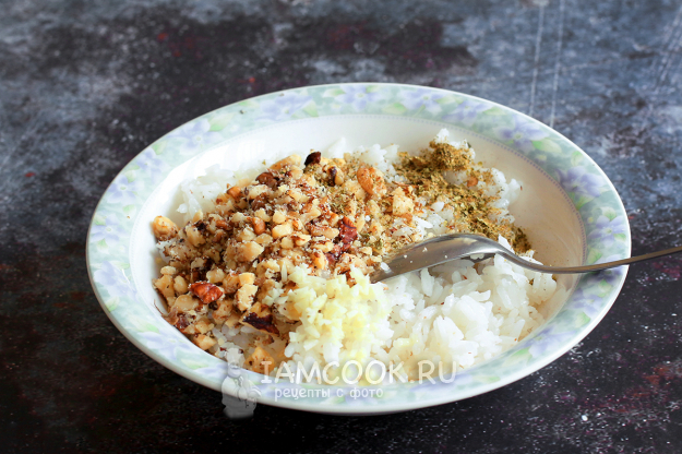 Отварной рис смешайте с рублеными орехами, ложкой растительного масла, чесноком и хмели-сунели. Посолите по вкусу и перемешайте до однородности.