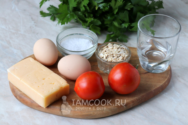 Возьмите необходимые продукты для приготовления овсяноблина с сыром и помидором.