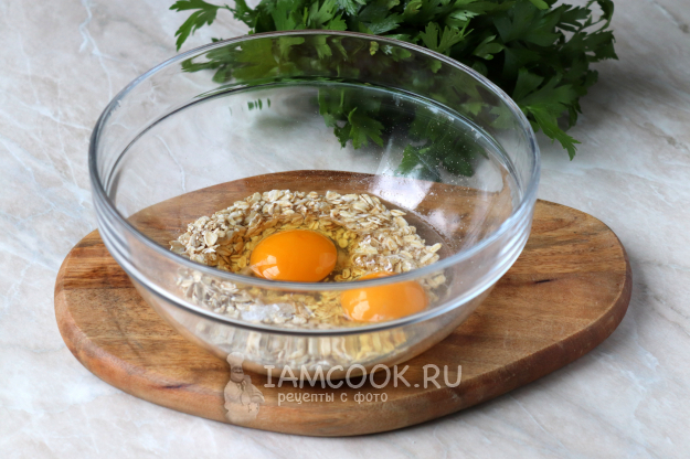 Хлопья быстрого приготовления насыпьте в глубокую миску, добавьте щепотку соли, куриные яйца и чистую фильтрованную воду комнатной температуры. Воду по желанию можно заменить молоком или кефиром.