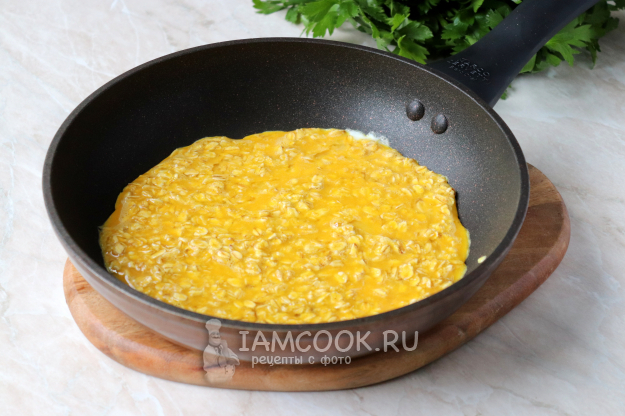 Спустя время вылейте овсяно-яичную смесь на разогретую сковороду, предварительно смазанную тонким слоем растительного масла. Если у вас сковорода с хорошим антипригарным покрытием - её можно ничем не смазывать. Из теста сформируйте большую круглую лепёшку (как на фото). Сделайте умеренный огонь и выпекайте блин по 2-3 минуты с каждой стороны до золотистого цвета. Переворачивайте его с помощью широкой деревянной или силиконовой лопатки.