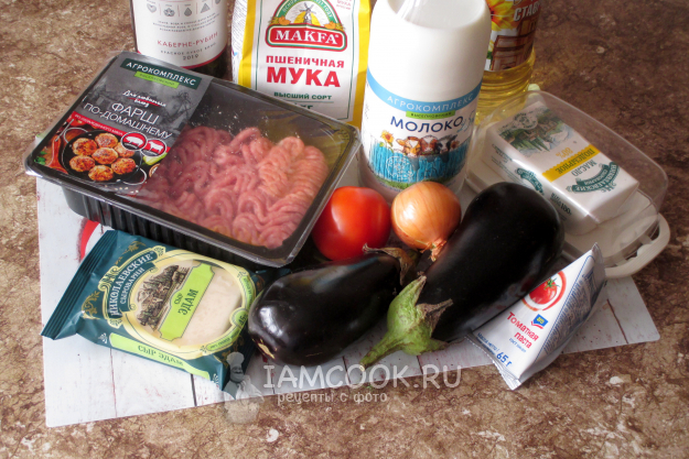 Возьмите ингредиенты для приготовления мусаки с баклажанами и фаршем в мультиварке по списку к рецепту.