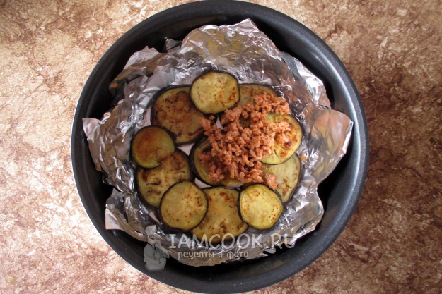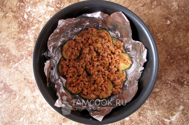Первым слоем на дно чаши уложите баклажаны в два ряда, перекрывая просветы, затем мясной фарш, снова баклажаны и на них - вторую часть фарша и опять баклажаны.