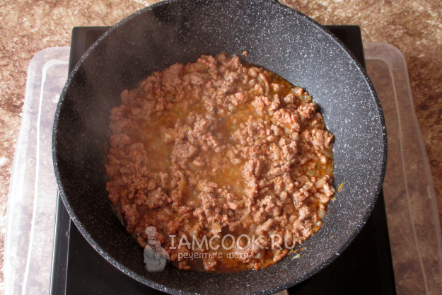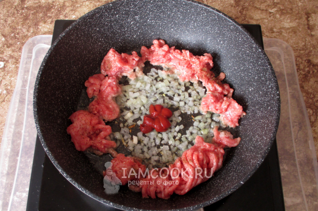 Для мясной начинки сначала обжарьте нашинкованный лук на растительном масле, слегка посолите. Добавьте сырой фарш, посыпьте его молотым черным перцем по вкусу, измельченный чеснок по желанию и томатную пасту. Обжарьте всё вместе минуты три на сильном огне.