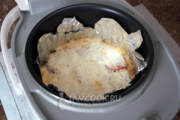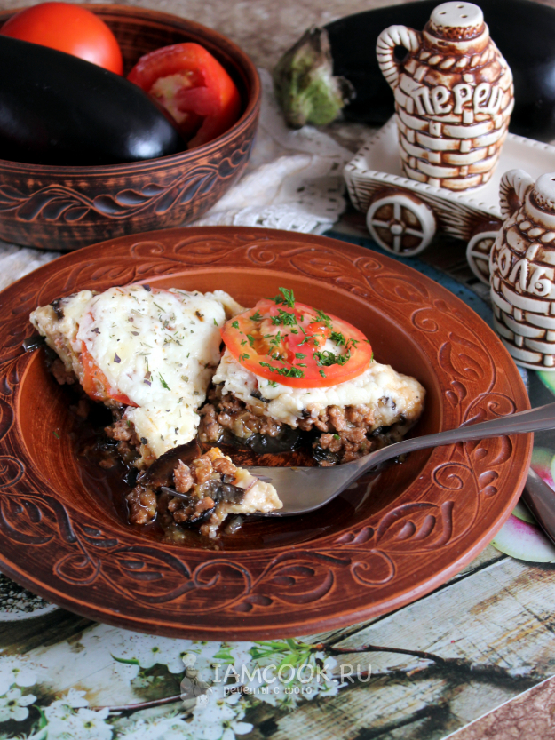 Затем мусаку можно достать из чаши. Удобно это сделать, наклонив чашу над плоским блюдом и вытащив боком запеканку, придерживая за фольгу. Поделите на порции.