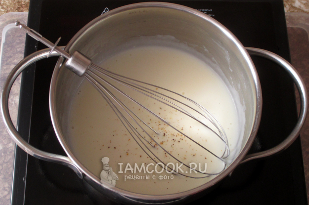 Когда соус загустеет, добавьте тертый мускатный орех, ещё раз перемешайте, снимите с огня и укройте от высыхания поверхности, например, пищевой плёнкой или уж просто крышкой.