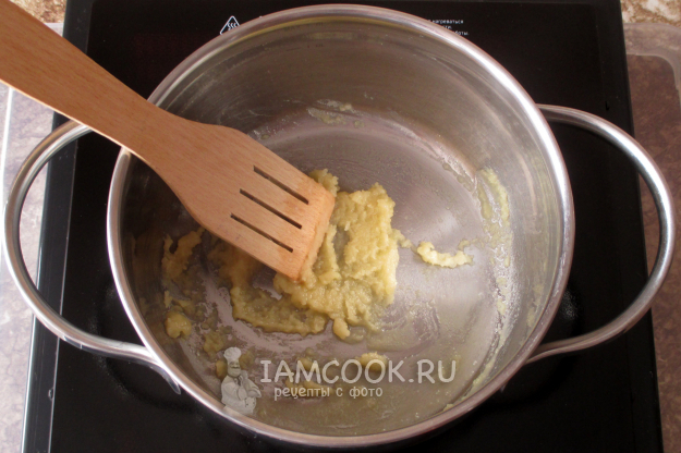 Для приготовления варианта соуса бешамель расплавьте сливочное масло на среднем огне в кастрюльке или сотейнике. Добавьте муку и обжарьте её при постоянном помешивании трущими движениями. Слегка посолите.