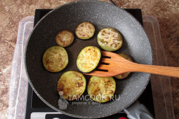 Баклажаны тонко нарежьте, например, кружочками толщиной 3-4 мм. Если сорт баклажанов горчащий, то посыпьте их солью и оставьте на полчаса. Затем соль и выступивший сок смахните. Обжарьте кружочки баклажанов на сковороде на растительном масле (традиционно – оливковом, но сгодится и подсолнечное).