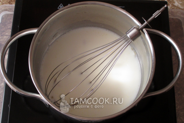 Влейте молоко, доведите до закипания, но на среднем огне. Удобно это делать, разбив комочки венчиком, и постоянно перемешивать лучше тоже им же. Не допускайте пригорания!