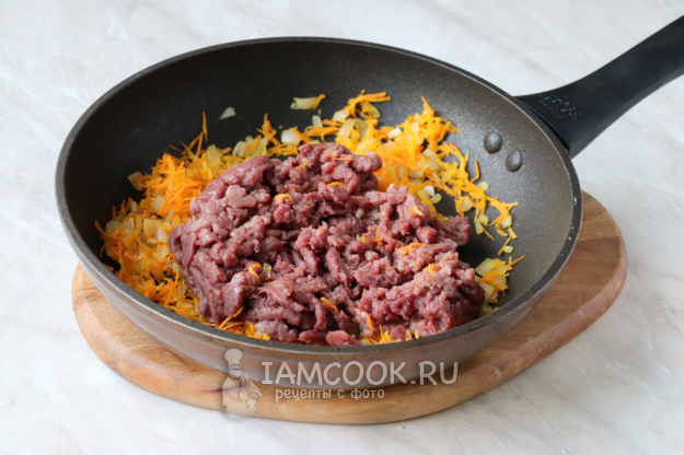 Затем к обжаренным овощам добавьте фарш, у меня - из филейной части гуся, вы же можете использовать свиной, говяжий, куриный, ассорти и т.п. Жарьте всё вместе ещё 5-7 минут, перемешивая лопаткой. Специи добавьте по вкусу.