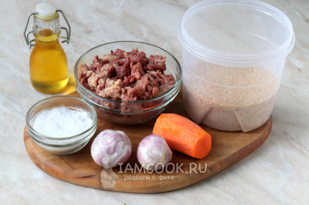 Для приготовления пшеничной каши с фаршем подготовьте продукты по списку. Лук и морковь заранее почистите. Пшеничную крупу промойте в холодной воде, меняя её 3-4 раза.