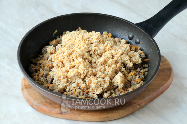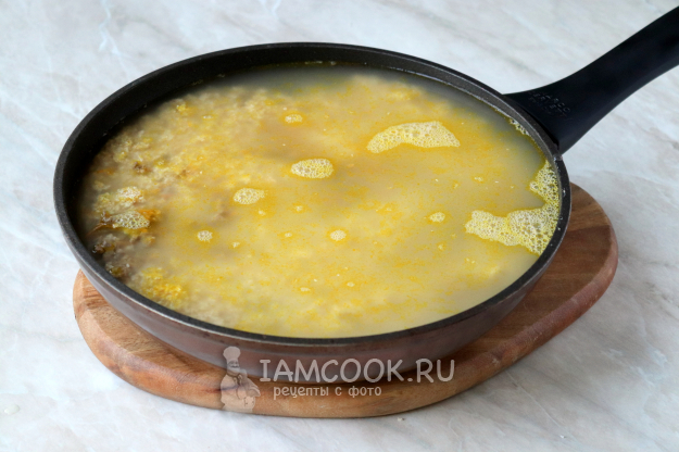 Содержимое сковороды залейте чистой водой в соотношении 1:2,5. Чтобы жидкость быстрее закипела, можно сразу использовать кипяток. Если нужно - добавьте ещё соли, и доведите жидкость до кипения. Затем уменьшите огонь до минимального и варите кашу около 15-20 минут, периодически помешивая. Точное время приготовления указано на упаковке с крупой.
